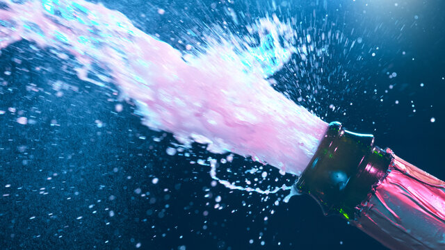 Champagne explosion with flying cork closure, opening champagne bottle closeup, celebration theme.