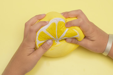 Child hands squeezing a red strawberry Squishy toy