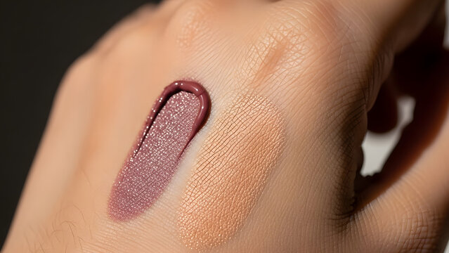 Swatches of Matte Berry Liquid Lipstick and Shimmering Gold Eyeshadow on Hand Skin, Close-up Macro Shot