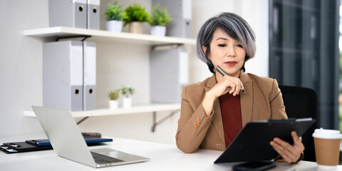 Asian Business woman planning, taking notes and writing in a paper while reading a report, document or paperwork in an office alone at work. One serious corporate professional working at a desk.