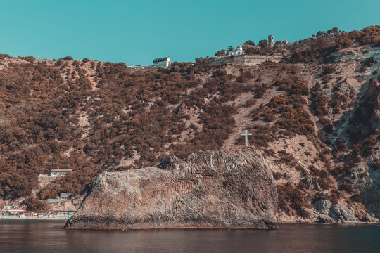 The chapel of St George (Agios Giorgios), near Drakonon, Ikaria island, Greece. Serene coastal chapel surrounded by lush greenery and rocky landscape with a calm sea view.