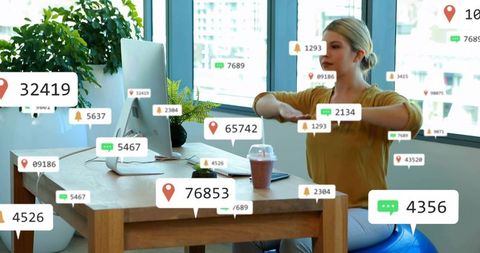 Remote worker stretching on stability ball at modern desk with social media alerts