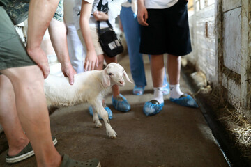 Cow licking person hand in barn with fence in background, sign love animal health care