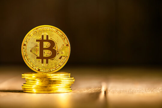 A pile of golden bitcoins stacked on top of each other. Can be used to illustrate cryptocurrency, digital currency, or financial investments
