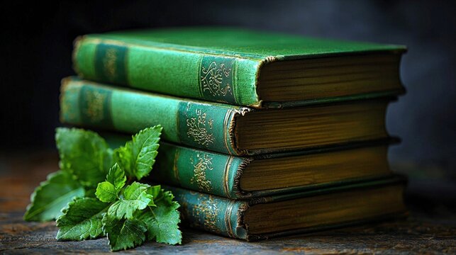 A stack of diverse books on a rustic wooden surface, with a softly blurred background of green foliage. It conveys learning and the beauty of reading in nature.