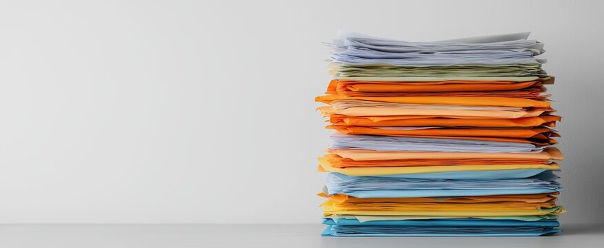 Stack of Colorful Folders and Papers, A large stack of colorful folders and documents on a white surface with a plain background, symbolizing organization and paperwork.