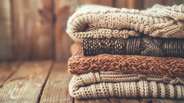 Stack of folded sweaters on wooden table cozy home wardrobe organization and sustainable slow fashion