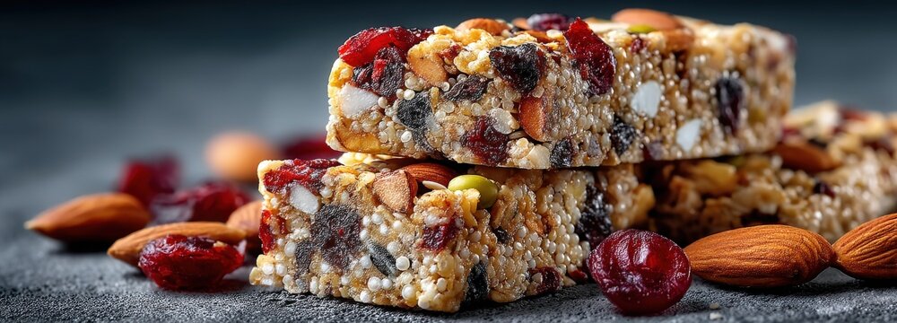 Nutritious granola bars with quinoa, almonds, and cranberries stacked on a clean surface