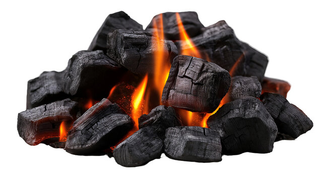 Black Charcoal Briquettes Glowing Embers, Hot Fire for BBQ and Grill Displays, isolated on transparent background.