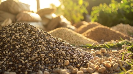 Ground-Level View of Seed Heap with Various Cereals and Grains, Green Leaves, and Biomass Briquettes in Sunlight