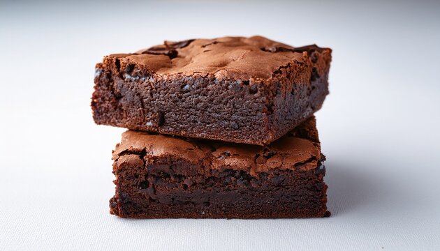 two gooey chocolate brownies stacked with rich moist texture on white background