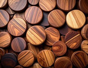A close-up view presents a vibrant display of stacked wood slices, revealing intricate patterns and rich colors. The circles are cut ends