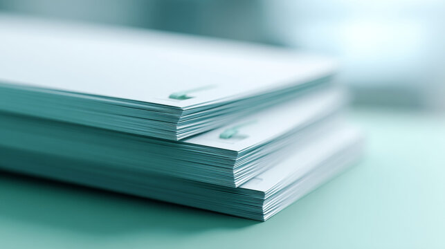 Close-up of stacked white paper sheets with paper clips on a smooth surface in soft natural light