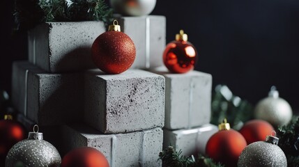 A collection of Christmas ornaments stacked on top of cement blocks, a unique and creative display