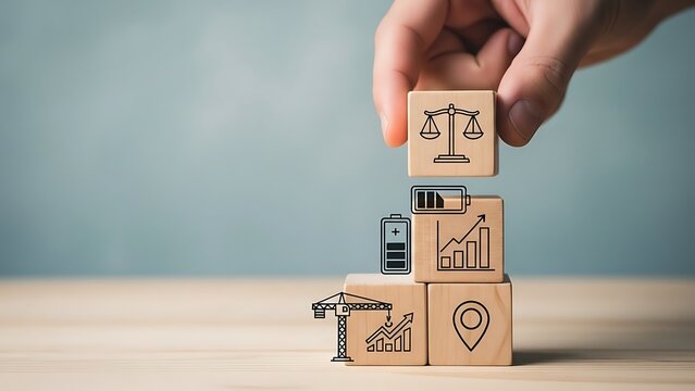 Wooden blocks with business icons representing growth, location, battery life, and legal balance being stacked