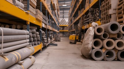 Wide-angle shot of an industrial warehouse filled with construction materials, including wooden pallets, metal pipes, and concrete blocks, clean and organized.