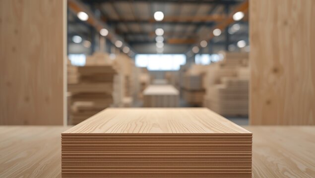 Wooden chipboards stacked in a hardware store. Building materials for construction and furniture. Close-up of a pile of wood panels. Industrial interior storage.