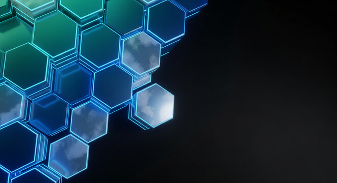 Group of stacked blue and green luminous hexagon, geometric shape on dark surface, representing modern technology or structure, free space available