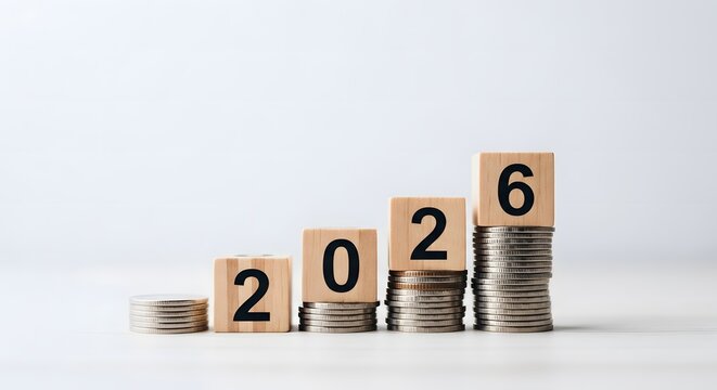Wooden blocks with numbers 2026 stacked on growing piles of coins.