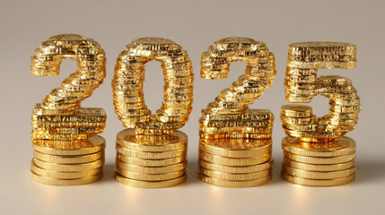 Golden coins stacked with numbers 2025, symbolizing wealth and prosperity for upcoming year. shiny texture and bright color evoke sense of optimism and financial success