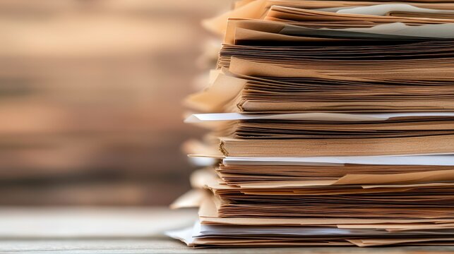 A close-up view of a messy stack of papers on a wooden desk, highlighting the chaos of paperwork in an office environment.