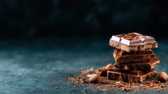 Close-up of stacked dark chocolate pieces topped with colorful sprinkles, arranged neatly on a smooth white marble slab, high detail, natural lighting