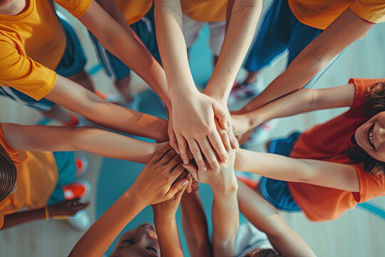 Team of kids children basketball players stacking hands in the court, sports team together holding hands getting ready for the game