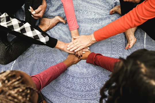 The top-view of diverse people nationalities fold their hands together on each other, symbolizing their unity and support. A team of people who are set up for productive work and a positive result.