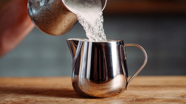 Hand holding a stainless steel milk pitcher for preparing a hot beverage with a cup of coffee in the background illustrating the process of making latte art with frothy milk