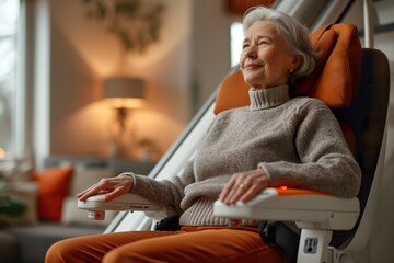 Smiling senior woman using modern stair lift in bright home interior, symbolizing elderly independence, accessibility, mobility support, and safe living solutions