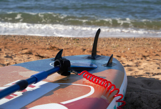 A row of colorful paddleboards of various sizes rests on the sandy beach, ready for an adventure on the sea under the bright summer sky.