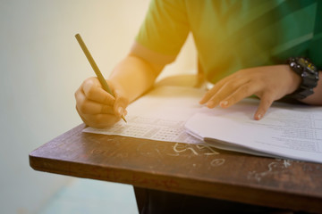 Student check Answer choice with pencil on optical form of standardized test answers bubbled score and a black paint examination box,Answer sheet School,education in university concept