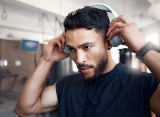Music on, now lets begin. Shot of a sporty young man listening to music while exercising in a gym.