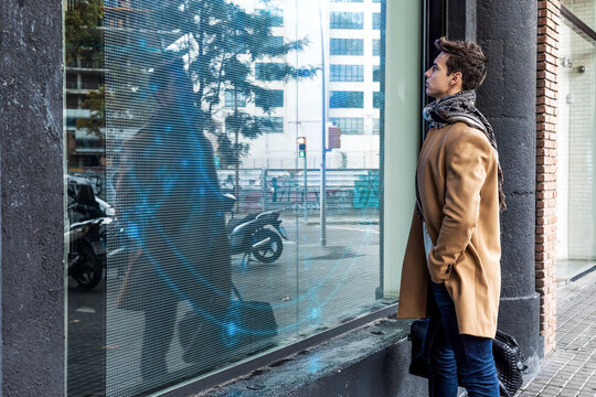 Handsome man standing by shop window showcase outdoors