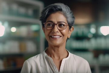indian senior female pharmacist's standing at medical store