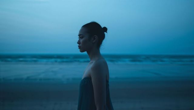 Asian woman standing at twilight beach gazing toward calm ocean horizon in blue minimal profile