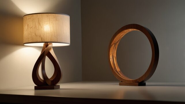 Illuminated modern wooden table lamps; one with a fabric shade, the other a minimalist ring design.