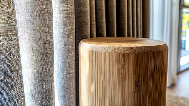 Wooden stool stands near curtains in a sunny room. Interior design element