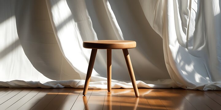 Minimalist wooden stool standing on polished floor in soft sunlight with flowing white curtains in the background, creating a calm and stylish interior design scene
