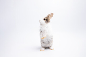 Little brown and white rabbit standing on isolated white background with clipping path. It's small mammals in the family Leporidae of the order Lagomorpha.