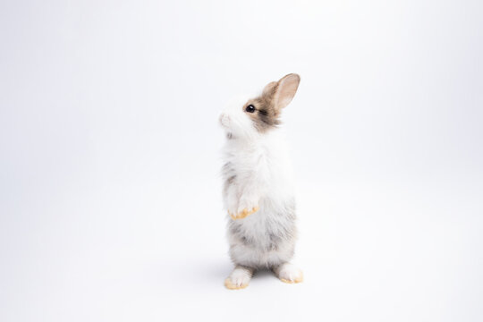 Gray brown fur rabbit Standing with 2 hind legs  and looked up to the back, On white background, to pet and animal concept.
