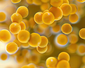Golden yellow Staphylococcus aureus, spherical clusters, floating in clear liquid, detailed cellular background.