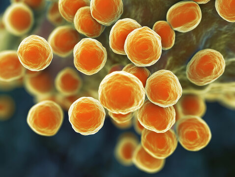 Staphylococcus Aureus Bacteria Under Microscope. Bacterial Colonies of Staphylococcus Aureus in 3D. Pathogenic Bacteria Staphylococcus Aureus in Detail