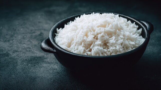 Steamed white rice fills a dark textured bowl resting on a moody surface