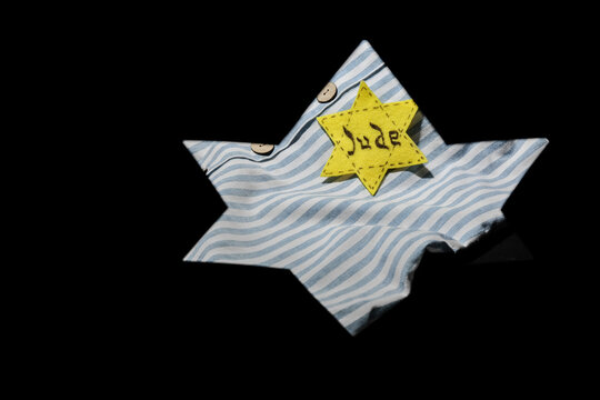 Prisoner uniform and Jewish badge visible through shape of David star on black background with space for text. International Holocaust Remembrance Day