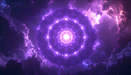 A vibrant illustration presents a central, ornate mandala radiating light against a cosmic nebula backdrop of swirling colors