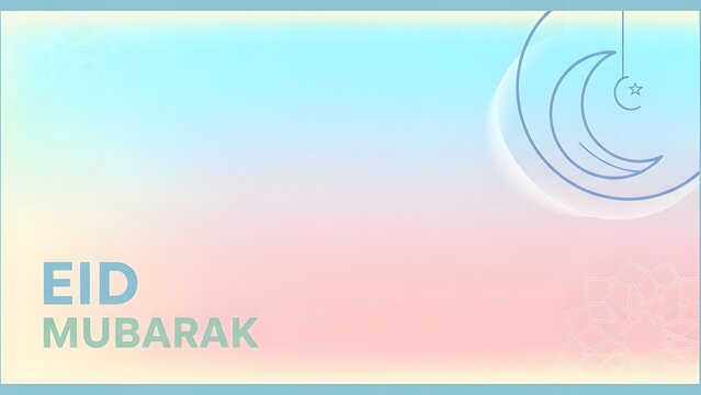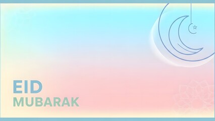 Eid Mubarak greeting card with crescent moon, star, and mandala on a soft pastel background.