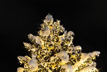Decorated christmas tree in the center of Tallinn. christmas tree with lights covered with snow. close up