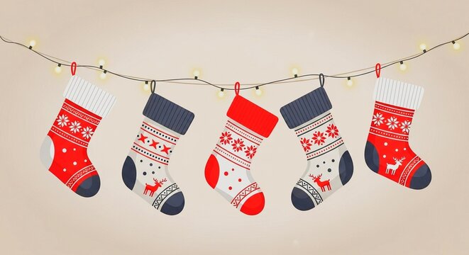 Hand-drawn festive string lights border on cream holiday card template with stars