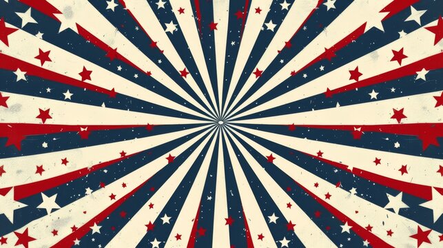 A retro-inspired starburst pattern in the American flag colors with central stars and stripes, capturing vintage charm and historical elegance for a nostalgic feel.